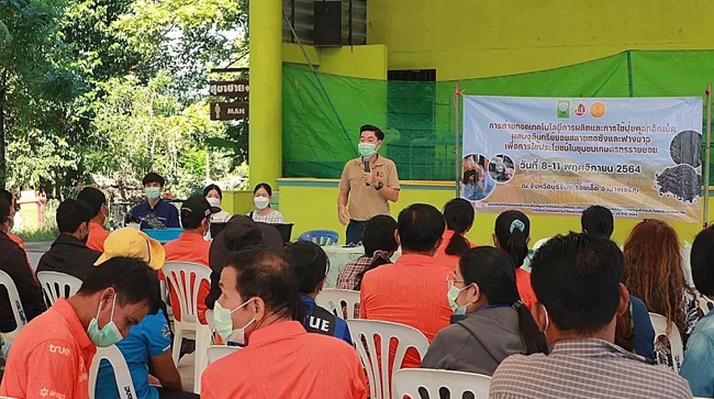 Assoc. Prof. Dr. Dusit Athinuwat, Department of Agricultural Technology, Faculty of Science and Technology, Thammasat University received a grant from the National Research Council of Thailand (NRCT), Ministry of Higher Education, Science, Research and Innovation (MHESI) for research and development on the production of microorganism-infused manure pellets for rice stubble and straw in rice field decomposition to reduce the burning of rice straw and rice stubble in the farmer community. Later, continued to receive funding in conveying the production technology and the use of manure to farmers. The project was completed in early 2022 by operating in 10 provinces under cooperation with Internal Security Operations Command (ISOC) in 6 northeastern provinces, namely; Udon Thani, Roi Et, Buriram (2 areas), Nakhon Ratchasima, Khon Kaen, Amnat Charoen and the central region, namely; Kanchanaburi and Nakhon Nayok, the eastern Department of Agricultural Technology, Faculty of Science and Technology, Thammasat University region in Chonburi Province. In every area, there will be pilot plots of 5 rai for operation demonstration and training to educate farmers on microorganisms’ production, expansion and preservation and the production of manure pellets to ensure that the farmers are able to start the production by themselves.