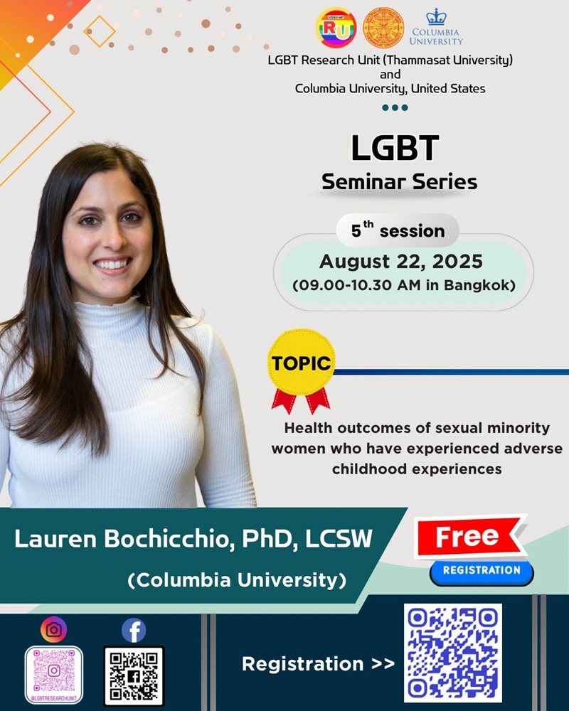 Get ready for the 5th session of the 2025 LGBT Seminar Series (Online)! On August 22, 2025, from 9:00-10:30 AM (Thailand time), Dr. Lauren Bochicchio from the School of Nursing, Columbia University USA. will share her experience on "Health outcomes of sexual minority women who have experienced adverse childhood experiences." This is a can't-miss event for incredibly valuable perspectives!