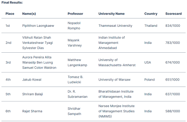 In the final round of the competition, Pipitthon was able to win the world championship with a score of 834 out of 1,000, defeating competitors from the Indian Institute of Management in India, University of Massachusetts - Amherst in the United States, University of Warsaw in Poland, Bharathidasan Institute of Management, and Narsee Monjee Institute of Management Studies, both from India.