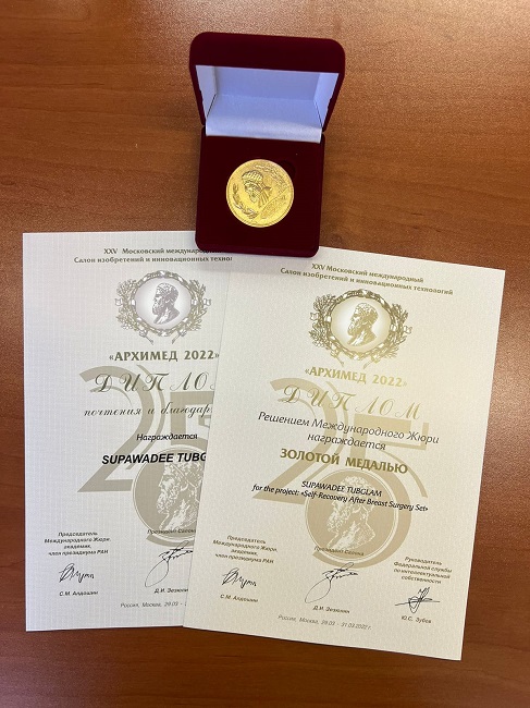 Asst. Prof. Supawadee Tubklum, Nursing Professor, Faculty of Nursing, Thammasat University foresaw problems that arise after breast cancer surgery which affect patients both physically and mentally, thus led to the invention of innovative solutions ‘the devices to promote physical rehabilitation after breast cancer surgery’ by which the latest version won a gold medal from the International Innovation Competition "XXV Moscow International Inventions and Innovative Technologies Salon (ARCHIMEDES-2022)", the largest international innovation exhibition in Eastern Europe. The innovation are in the process of authorizing grant protection from the Department of Intellectual Property.