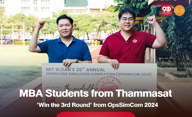 The 'tbs_excelcalibur' team, MBA students, has won their World Championship for the 3rd round from the Operation Simulation Competition 2024 (OpsSimCom 2024) organized by MIT Sloan School of Management, with 51 teams from around the world participating, and 3 teams form Thammasat University ranked in the Top 10.