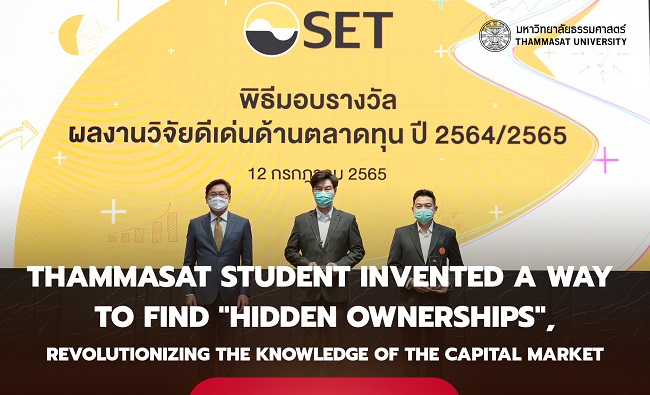 The research entitled “Hidden Ownerships and Corporate Governance” by Nattawut Waengwan, a Ph.D. student, Faculty of Commerce and Accountancy, Thammasat University proposes a practical way to measure ratios, which is considered a great revolution in capital markets knowledge. In addition, it received an outstanding research award in the capital market from the event to promote the production of capital market research to further benefit the development of the Thai capital market in 2021/2022 by the Stock Exchange of Thailand.