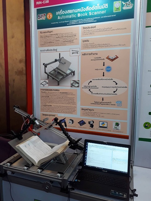 Mr. Alexander Hewett informs us about the concept and working mechanism of “Automatic Book Scanner”. Currently, it consumes enormous time to scan the whole book because we have to do it page by page. It wastes time to convert book into E-Book in order to conserve old books. In the present, there are semi-automatic and automatic book scanner producer. However, in Thailand, we do not have producer and still have to import book scanner. The import price is high so we think of inventing book scanner that is low cost and easy to use. This automatic book scanner is used for converting the whole book into E-Book. It is convenient for readers to access to the information. Moreover, it is automatic so it saves time scanning book when we compared to normal scanner. This machine has automatic arm that is used to open the book. It has camera to collect book information and computer to process and compile information from the camera to make an E-Book.