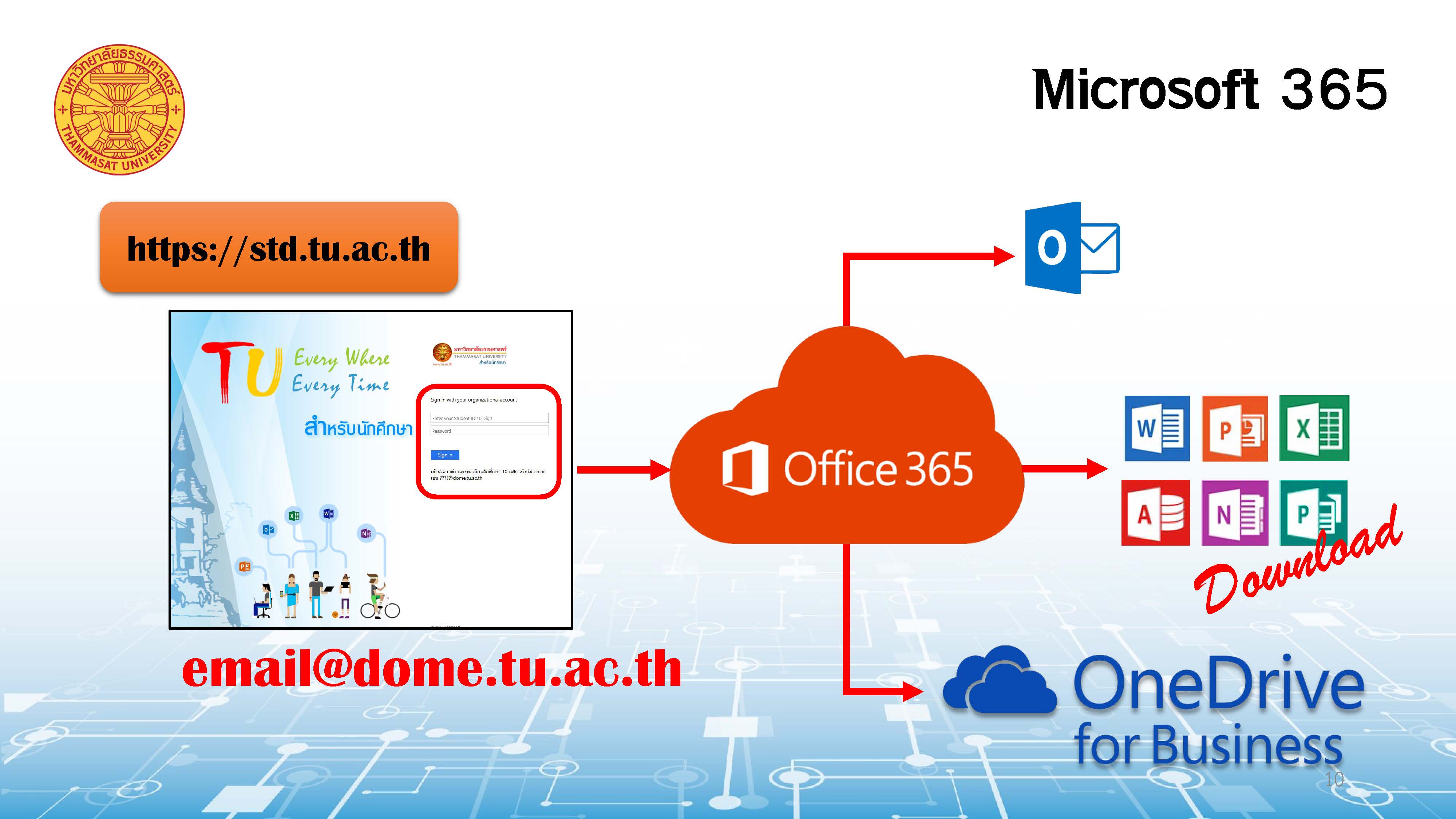 • สำหรับนักศึกษา เข้าใช้ office 365 ที่ URL http://std.tu.ac.th