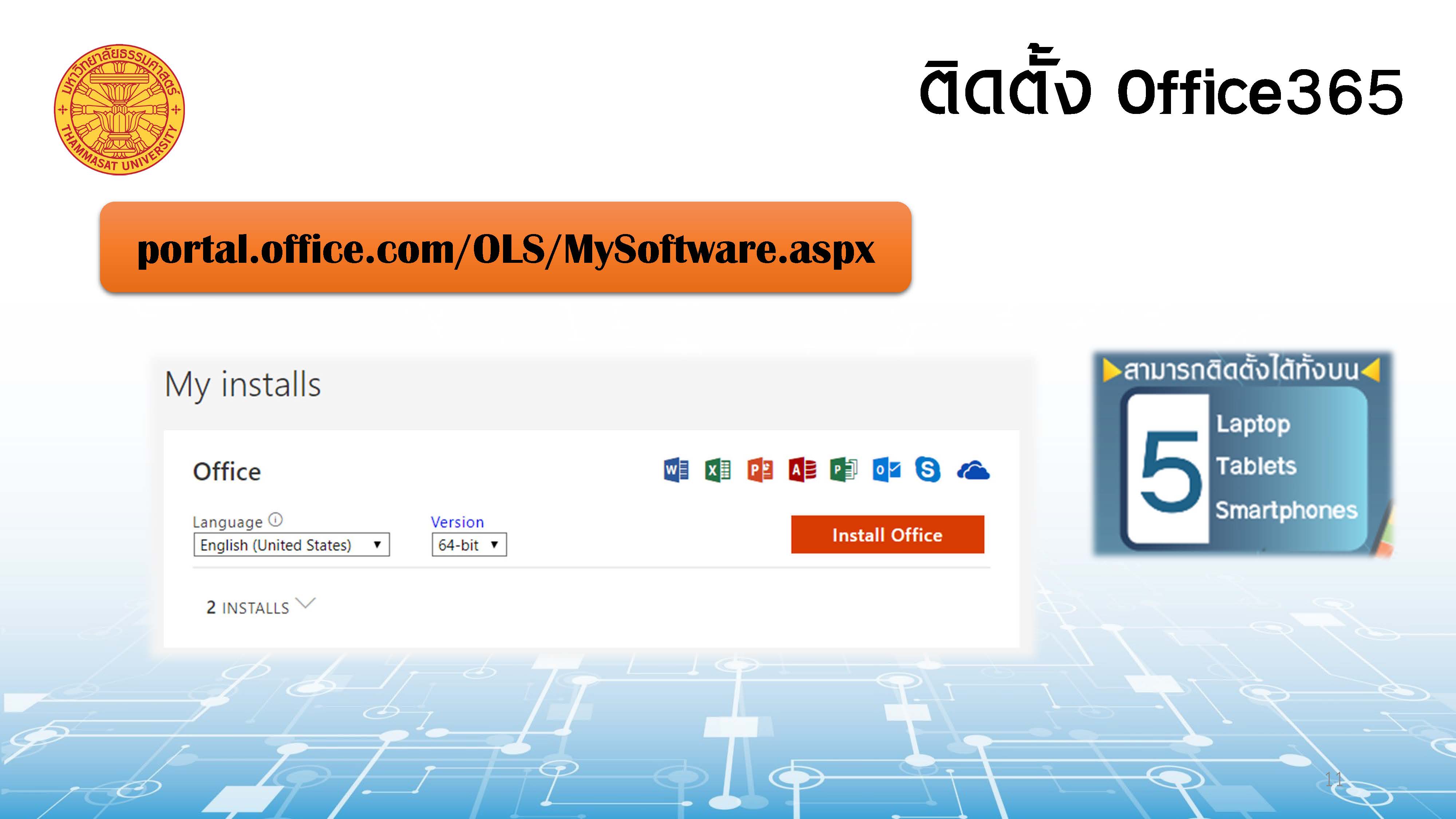 จำเป็นต้องมีการเชื่อมต่ออินเทอร์เน็ตในการติดตั้ง และเปิดใช้งานชุดโปรแกรม Office365 เพื่อจัดการบัญชีการใช้งาน เช่น ในการติดตั้ง Office บนพีซีเครื่องอื่น นอกจากนี้ การเชื่อต่ออินเทอร์เน็ตยังจำเป็นต่อการเข้าใช้เอกสารที่จัดเก็บบน OneDrive อีกด้วย เว้นแต่จะติดตั้ง แอป OneDrive สำหรับเดสก์ท็อป และควรเชื่อมต่ออินเทอร์เน็ตเป็นประจำ เพื่อคอยอัปเดต Office ให้เป็นเวอร์ชั่นล่าสุดเสมอ และใช้ประโยชน์จากการอัปเกรดอัตโนมัติ ถ้าไม่ได้เชื่อมต่ออินเทอร์เน็ตทุก ๆ 39 วันเป็นอย่างน้อย แอปพลิเคชันก็จะเปลี่ยนไปเป็นโหมดการทำงานที่ปรับลดลง ซึ่งหมายความว่า เราจะสามารถดูหรือพิมพ์เอกสารได้ แต่จะไม่สามารถแก้ไข หรือสร้างเอกสารใหม่ได้ เมื่อต้องการเปิดใช้งานแอปพลิเคชั่น Office ของเราใหม่ เราเพียงแค่เชื่อมต่อกับอินเทอร์เน็ตอีกครั้ง เราไม่จำเป็นต้องเชื่อมต่ออินเทอร์เน็ตเพื่อใช้งานแอปพลิเคชั่น Office เช่น Word, Excel และ PowerPoint เนื่องจากแอปพลิเคชั่นเหล่านี้ ได้รับการติดตั้งบนคอมพิวเตอร์อย่างสมบูรณ์แล้