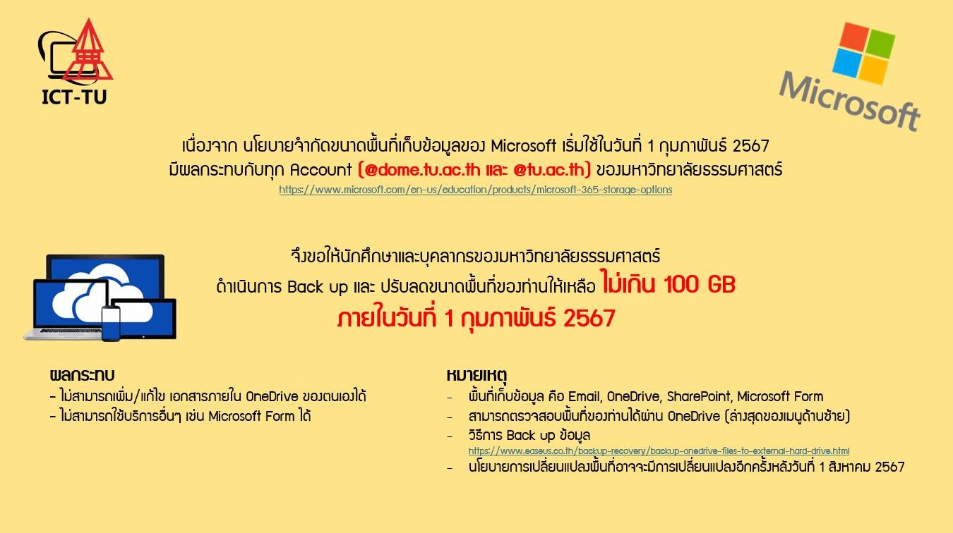 OneDrive คือบริการที่เก็บข้อมูลออนไลน์ที่สามารถใช้เพื่อจัดเก็บเอกสาร บันทึกย่อ รูปถ่าย เพลง วิดีโอ หรือไฟล์ประเภทอื่นได้ OneDrive ทำให้สามารถเข้าถึงไฟล์จากอุปกรณ์เกือบทั้งหมด และสามารถแชร์ข้อมูลเหล่านั้นกับผู้อื่นได้นวนพื้นที่จัดเก็บเพิ่มเติมของ OneDrive ที่จะได้รับนั้น ขนาด 100GB