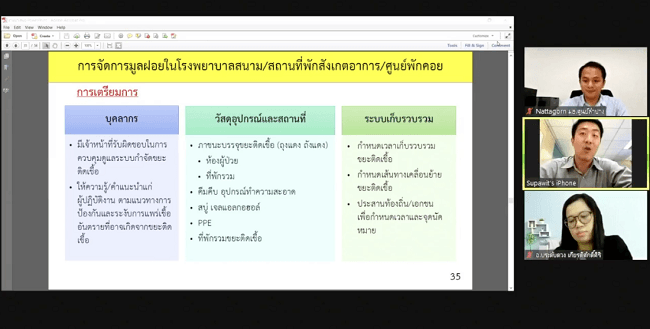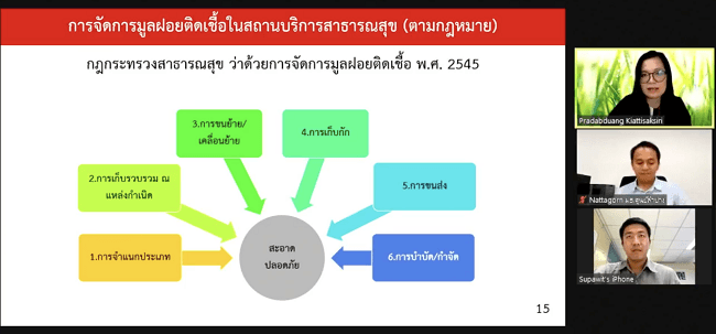 คุณศุภวิทย์ อมรยุทธ์ นักวิชาการสาธารณสุขชำนาญการ ศูนย์อนามัยกลุ่มชาติพันธุ์ชายขอบ และแรงงานข้ามชาติ กล่าวว่า การจัดการขยะติดเชื้อของโรงพยาบาล ในกรณีตัวอย่างของโรงพยาบาลลำปาง ใช้วิธีการกำจัดขยะติดเชื้อโดยใช้วิธีการทำลายเชื้อด้วยไอน้ำ (Autoclaving) ตามขั้นตอนที่กฎหมายกำหนดแล้ว ต้องมีการตรวจสอบเกณฑ์มาตรฐานทางชีวภาพโดยวิธีการตรวจสอบเชื้อ (Spore Test) ส่วนการกำจัดขยะติดเชื้อด้วยวิธีการเผาในเตาเผา ต้องควบคุมอุณหภูมิห้องเผาให้ได้ตามที่กฎหมายกำหนดด้วย และในส่วนของการจัดการขยะติดเชื้อของโรงพยาบาลสนามและสถานที่พักคอย โดยหลักการแล้วไม่แตกต่างจากการจัดการขยะติดเชื้อของสถานพยาบาล โดยเน้นเรื่องความสะอาดและปลอดภัย วิธีการเก็บรวบรวม ขั้นตอนการขนย้ายขยะติดเชื้อ ผู้ปฏิบัติงาน วัสดุอุปกรณ์ จนถึงวิธีการกำจัด ต้องเป็นไปตามกฎหมายกำหนด ส่วนกลุ่มรักษาตัวที่บ้าน (Home Isolation) ก็มีวิธีแนะนำการกำจัดขยะติดเชื้อสำหรับทำเองได้ที่บ้าน การคัดแยกให้บรรจุใส่ในถุงขยะติดเชื้อ (ถุงแดง) มัดปากถุงแล้วพ่นน้ำยาฆ่าเชื้อใส่ถุงอีกชั้น เก็บรวบรวมไว้ในจุดที่ปลอดภัย และประสานหน่วยงานที่เกี่ยวข้องเข้ามารับขยะติดเชื้อ เช่น องค์กรปกครองส่วนท้องถิ่น บริษัทเอกชน โรงพยาบาลชุมชน หรือโรงพยาบาลส่งเสริมสุขภาพตำบลเพื่อนำไปกำจัดต่อไป หากในพื้นที่ไม่มีบริการรวบรวมขยะติดเชื้อไปกำจัด ให้บรรจุในถุงดำ ราดน้ำยาฆ่าเชื้อ พร้อมบรรจุลงถุงอีกชั้น พร้อมเขียนระบุให้ชัดเจนว่าในถุงดังกล่าวมีขยะประเภทใดอยู่