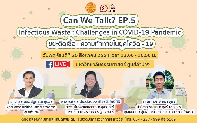มหาวิทยาลัยธรรมศาสตร์ ศูนย์ลำปาง จัดเสวนา Can we talk? EP.5 หัวข้อ Infectious Waste : Challenges in COVID-19 Pandemic ขยะติดเชื้อ : ความท้าทายในยุคโควิด – 19 ในประเด็นของการจัดการขยะติดเชื้อในช่วงการแพร่ระบาดของโรคโควิด - 19 เมื่อวันที่ 26 สิงหาคม 2564 ผ่านทางออนไลน์ โดยได้รับเกียรติจาก อาจารย์ ดร.ณัฐกรณ์ ชูช่วย ผู้ช่วยอธิการบดีฝ่ายบริหารและวิชาการ ศูนย์ลำปาง อาจารย์ ดร.ประดับดวง เกียรติศักดิ์ศิริ อาจารย์ประจำคณะสาธารณสุขศาสตร์ มหาวิทยาลัยธรรมศาสตร์ ศูนย์ลำปาง และคุณศุภวิทย์ อมรยุทธ์ นักวิชาการสาธารณสุขชำนาญการ ศูนย์อนามัยกลุ่มชาติพันธุ์ชายขอบ และแรงงานข้ามชาติ เป็นวิทยากรบรรยาย