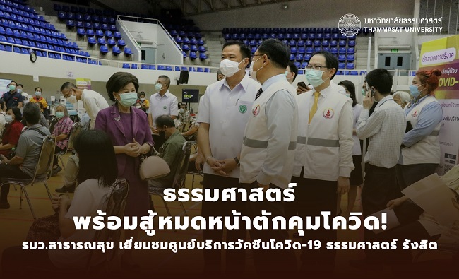นายอนุทิน ชาญวีรกูล รองนายกรัฐมนตรี และ รมว.สาธารณสุข (สธ.) เดินทางเยี่ยมชมการดำเนินงานของศูนย์รับวัคซีนโควิด-19 ธรรมศาสตร์รังสิต ณ อาคารยิมเนเซียม 4 มหาวิทยาลัยธรรมศาสตร์ ศูนย์รังสิต เมื่อวันที่ 2 ก.ค. 2564 พร้อมให้กำลังใจบุคลากรและจิตอาสาที่เสียสละปฏิบัติงานอย่างเข้มแข็ง โดยมี ศ.ดร.สุรพล นิติไกรพจน์ ประธานกรรมการบริหารโรงพยาบาลธรรมศาสตร์เฉลิมพระเกียรติ และ รศ.เกศินี วิฑูรชาติ อธิการบดีมหาวิทยาลัยธรรมศาสตร์ เป็นตัวแทนต้อนรับ