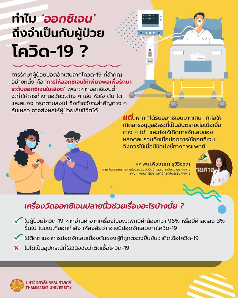 หากพูดถึงในสถานการณ์โควิด-19 นั้น เครื่องวัดออกซิเจนปลายนิ้วเป็นเพียงเครื่องที่ใช้ติดตามอาการปอดอักเสบเบื้องต้นของผู้ที่ถูกตรวจยืนยันว่าติดเชื้อโควิด-19 แล้ว ซึ่งจะช่วยบอกได้เบื้องต้นว่า ผู้ป่วยโควิด-19 รายนั้น ๆ มีอาการปอดอักเสบหรือไม่ และอาการเป็นมากหรือเป็นน้อยเพียงใด ‘ไม่ได้เป็นอุปกรณ์ที่ใช้วินิจฉัยว่าติดเชื้อโควิด-19’