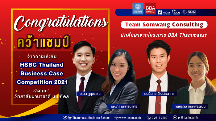 ในฐานะสถาบันการศึกษาชั้นนำของประเทศ มหาวิทยาธรรมศาสตร์ได้แสดงศักยภาพทางด้านวิชาการจนได้รับการยกย่องและชื่นชมในระดับชาติอีกครั้ง หลังจากนักศึกษาโครงการปริญญาตรีบริหารธุรกิจ หลักสูตรนานาชาติ (BBA) คณะพาณิชยศาสตร์และการบัญชี คว้ารางวัล “ชนะเลิศ” จากการแข่งขันรายการ HSBC Thailand Business Case Competition 2021 จัดขึ้นโดย มหาวิทยาลัยมหิดล เมื่อเร็ว ๆ นี้
