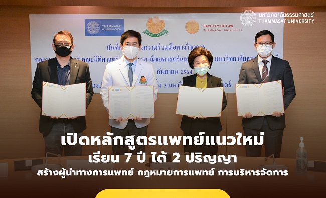รศ.เกศินี วิฑูรชาติ อธิการบดีมหาวิทยาลัยธรรมศาสตร์ เป็นประธานในพิธีลงนามบันทึกข้อตกลงความร่วมมือทางวิชาการระหว่างคณะแพทยศาสตร์ คณะนิติศาสตร์ และคณะพาณิชยศาสตร์และการบัญชี มหาวิทยาลัยธรรมศาสตร์ เปิดหลักสูตรร่วมปริญญาตรี แพทยศาสตรบัณฑิต และปริญญาโท ศิลปศาสตรมหาบัณฑิต สาขา “กฎหมายทางการแพทย์และสุขภาพ” และ สาขา ”การบริหารโรงพยาบาลและธุรกิจสุขภาพ” โดย รศ.นพ.ดิลก ภิยโยทัย คณบดีคณะแพทยศาสตร์ รศ.ดร.มุนินทร์ พงศาปาน คณบดีคณะนิติศาสตร์ และ ศ.ดร.รุธิร์ พนมยงค์ คณบดีคณะพาณิชยศาสตร์และการบัญชี ร่วมกันลงนาม เมื่อวันที่ 14 กันยายน 2564