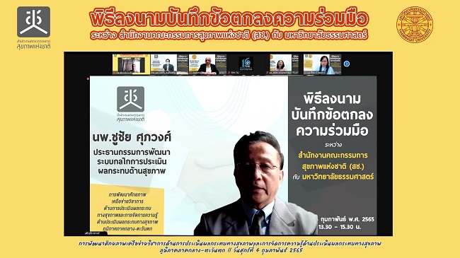 เมื่อวันที่ 4 ก.พ. 2565 มหาวิทยาลัยธรรมศาสตร์ และผู้บริหารสำนักงานคณะกรรมการสุขภาพแห่งชาติ (สช.) ร่วมกันลงนามในบันทึกข้อตกลงความร่วมมือทางวิชาการ การพัฒนาศักยภาพเครือข่ายวิชาการด้านการประเมินผลกระทบทางสุขภาพ และการจัดการความรู้ด้านประเมินผลกระทบทางสุขภาพ ภูมิภาคภาคกลาง-ตะวันตก โดยมีขอบเขตความร่วมมือด้านการพัฒนาบุคลากร งานวิจัย องค์ความรู้ ที่จะสนับสนุนและส่งเสริมการนำกระบวนการประเมินผลกระทบทางสุขภาพ หรือ Health Impact Assessment (HIA)