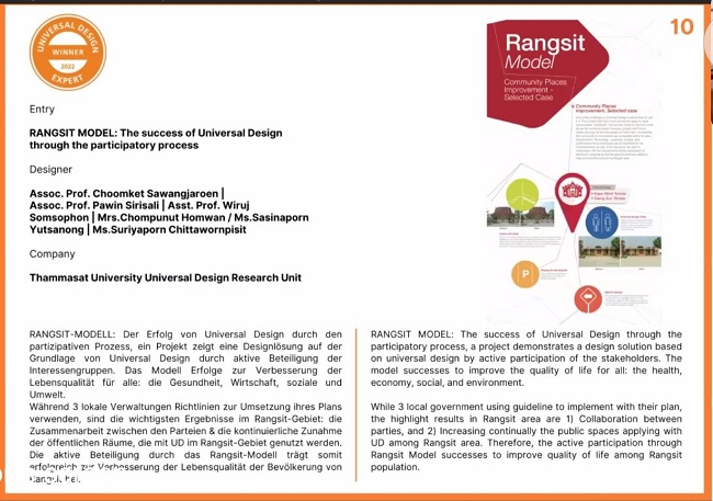 “รังสิตโมเดล” ผลงานของหน่วยวิจัยและออกแบบเพื่อคนทั้งมวล คณะสถาปัตยกรรมศาสตร์และการผังเมือง มหาวิทยาลัยธรรมศาสตร์ จากประเทศไทย ได้รับรางวัลชนะเลิศ “The winner of Universal Design Competition” ประจำปี 2565 ประเภท Expert จากสถาบัน Institute of Universal Design ประเทศเยอรมนี ในฐานะผลงานที่สร้างแรงขับเคลื่อนและเป็นประโยชน์ต่อคนทุกกลุ่มได้จริง โดยการแข่งขันดังกล่าวเป็นรายการแข่งขันที่มีมายาวนานกว่า 10 ปี และในปี 2565 มีตัวแทนประเทศเข้าร่วมกว่า 10 ประเทศ อาทิ เยอรมนี อังกฤษ จีน ญี่ปุ่น ฯลฯ