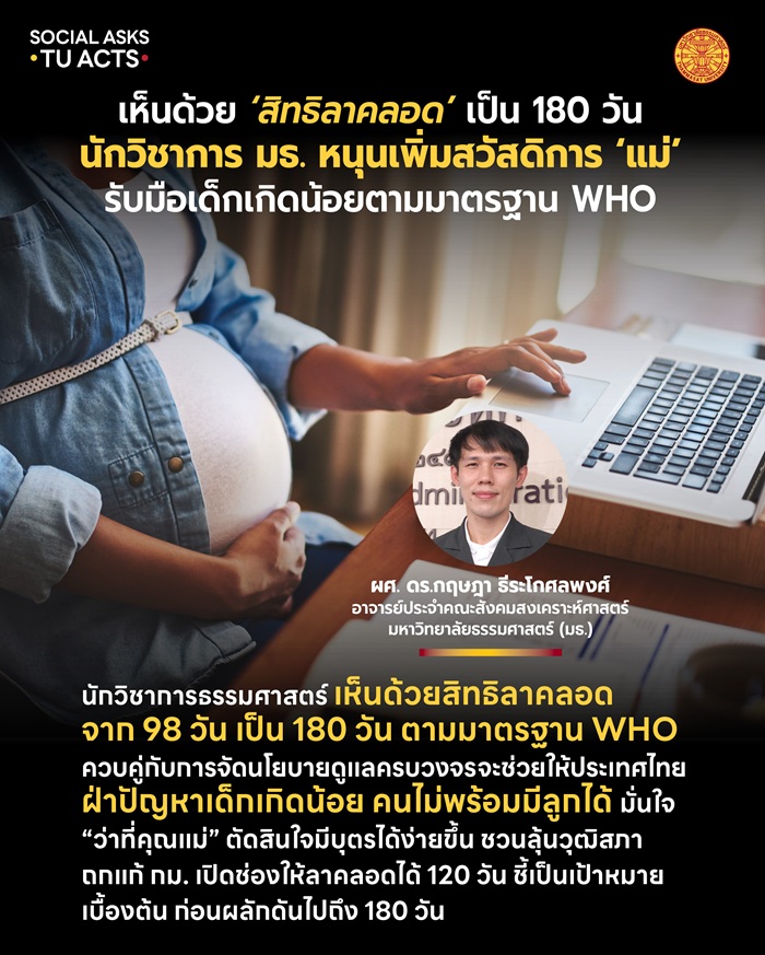 นักวิชาการธรรมศาสตร์ เห็นด้วยผลักดันสิทธิลาคลอดจาก 98 วัน เป็น 180 วัน ตามมาตรฐาน WHO ควบคู่กับการจัดนโยบายดูแลครบวงจร จะช่วยให้ประเทศไทยฝ่าปัญหาเด็กเกิดน้อย-คนไม่พร้อมมีลูกได้ มั่นใจ “ว่าที่คุณแม่” ตัดสินใจมีบุตรได้ง่ายขึ้น ชวนลุ้นวุฒิสภาถกแก้ กม. เปิดช่องให้ลาคลอดได้ 120 วัน ชี้เป็นเป้าหมายเบื้องต้น ก่อนไปถึง 180 วัน