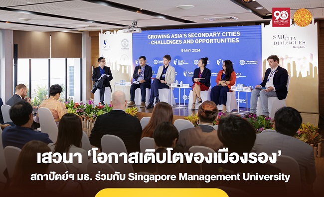 คณะสถาปัตยกรรมศาสตร์และการผังเมือง มหาวิทยาลัยธรรมศาสตร์ ร่วมกับ Singapore Management University (SMU) ประเทศสิงคโปร์ จัดงานเสวนาทางวิชาการ SMU City Dialogues ในหัวข้อ “Growing Asia’s Secondary Cities – Challenges and Opportunities” เมื่อวันที่ 9 พฤษภาคม 2567 ณ มหาวิทยาลัยธรรมศาสตร์ ท่าพระจันทร์
