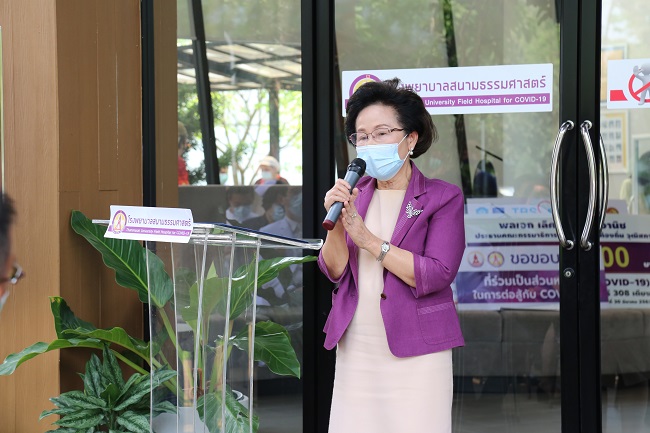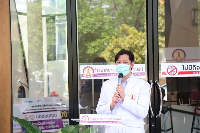 “โรงพยาบาลสนามเป็นการบริหารทรัพยากรที่มีอยู่อย่างเหมาะสม เพื่อรับมือกับโควิด-19 โดยโรงพยาบาลสนามธรรมศาสตร์มีแพทย์อาสาจำนวนกว่า 150 ท่าน ที่สมัครเข้ามาร่วมช่วยเหลือในการดูแล มีการนำเทคโนโลยีต่าง ๆ เข้ามาใช้เพื่อดูแลคนไข้ ลดจำนวนบุคลากรที่ใช้ โดยยังเน้นการดูแลทั้งทางร่างกาย และจิตใจ มีทีมนักจิตบำบัดเข้ามาช่วยประเมิน ตลอดจนการกลับสู่สังคม ซึ่งมีทีมสังคมสงเคราะห์มาช่วยกันเตรียมความพร้อมชุมชน ในการยอมรับผู้ป่วยที่จะกลับสู่สังคมต่อไป” ผศ.นพ.ฉัตรชัย กล่าว