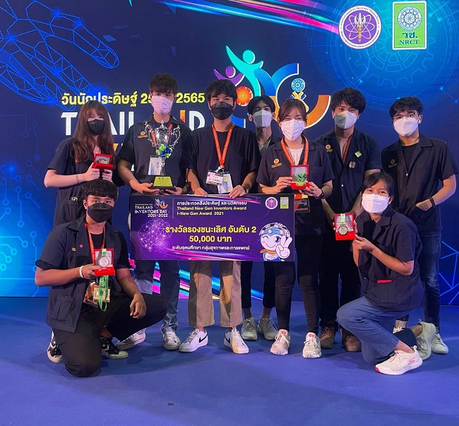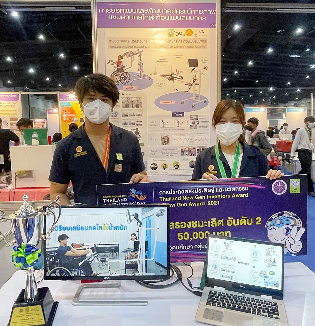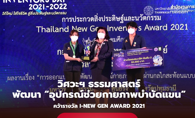 “การออกแบบและพัฒนาอุปกรณ์กายภาพแขนผ่านกลไกสะท้อนแบบสมมาตร” โดย น.ส.ธันยพร วงศ์วัชรานนท์ นักศึกษาปริญญาเอก สาขาวิศวกรรมทางการแพทย์ และนายเมธาสิทธิ์ เกียรติ์ชัยภา บัณฑิตระดับปริญญาโท ภาควิชาวิศวกรรมเครื่องกล คณะวิศวกรรมศาสตร์ มหาวิทยาลัยธรรมศาสตร์ สามารถคว้ารางวัลเหรียญทองและรางวัลรองชนะเลิศอันดับ 2 ระดับอุดมศึกษา ในกลุ่มสุขภาพและการแพทย์ จากเวทีการประกวดสิ่งประดิษฐ์และนวัตกรรม ( I-New Gen Award) ในงานวันนักประดิษฐ์ ประจำปี 2564 -2565 จัดโดย สำนักงานการวิจัยแห่งชาติ (วช.) กระทรวงการอุดมศึกษา วิทยาศาสตร์ วิจัยและนวัตกรรม นอกจากนี้ ยังได้รับรางวัลเหรียญทองแดง ในการประกวดสิ่งประดิษฐ์สำหรับคนพิการและผู้สูงอายุ ภายในประเทศ จัดโดย ศูนย์วิจัยเทคโนโลยีสิ่งอำนวยความสะดวกและเครื่องมือแพทย์ (A-MED) สวทช.