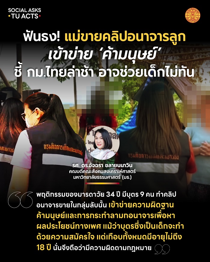นักวิชาการธรรมศาสตร์ เผย แม่อายุ 34 ทำคลิปอนาจารลูกเข้าข่ายความผิด “ค้ามนุษย์” ถึงแม้ลูกเต็มใจแต่ส่วนใหญ่อายุยังไม่ถึง 18 จึงมีความผิด ระบุพฤติกรรมเช่นนี้เพิ่มมากขึ้นในหลายประเทศ หวั่นไทยจะเกิดเหตุซ้ำอีก จี้รัฐเร่งประสานเจ้าของแพลตฟอร์มโซเชียลมีเดีย-ประเทศต้นทาง-ตำรวจสากล สกัดกั้นคลิป พร้อมยกตัวอย่างสหรัฐฯ เข้มกฎหมาย ล่วงละเมิดเด็กจำคุกตลอดชีวิต