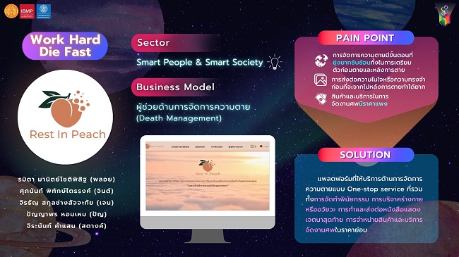 เมื่อความตายเป็นเรื่องใกล้ตัว... ทีม Work hard, Die fast นักศึกษาชั้นปีที่ 4 หลักสูตรควบตรี-โท ทางการบัญชีและบริหารธุรกิจ (IBMP) คณะพาณิชยศาสตร์และการบัญชี มหาวิทยาลัยธรรมศาสตร์ ประกอบด้วย จิระนันท์ คำแสน, ศุภนันท์ พิทักษ์ไตรรงค์, รมิตา มานิตย์โชติพิสิฐ, ปัญญาพร หอมเหม และ จิรธัญ สกุลช่างสัจจะทัย จึงคิดโมเดลธุรกิจ Rest in Peach แพลตฟอร์มบริการการจัดการความตายแบบครบวงจรขึ้น จนสามารถคว้ารางวัล Best Innovation ในงาน 88 INNOVBIZ: Designed for Better Life, Better Society จุดประกายไอเดียสตาร์ตอัปขับเคลื่อนสังคมไทย จัดโดย มหาวิทยาลัยธรรมศาสตร์ ณ อุทยานการเรียนรู้ป๋วย 100 ปี SDGs Lab มหาวิทยาลัยธรรมศาสตร์ ศูนย์รังสิต