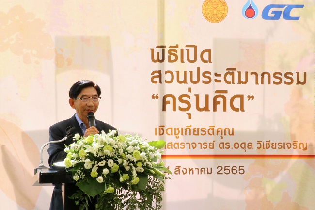 ดร.คงกระพัน อินทรแจ้ง ประธานเจ้าหน้าที่บริหารและกรรมการผู้จัดการใหญ่ บริษัท พีทีที โกลบอล เคมิคอล จำกัด (มหาชน) (GC) เผยว่า GC มีความยินดีเป็นอย่างยิ่งที่ได้มีส่วนร่วมสนับสนุนการจัดสร้างสวนประติมากรรมครุ่นคิดในครั้งนี้ ประติมากรรมครุ่นคิด จัดทำขึ้นโดยใช้แนวคิด Circular Living มาประยุกต์ใช้ตั้งแต่การคัดเลือกวัตถุดิบที่มาจากวัสดุที่เลิกใช้งานแล้วจากกระบวนการผลิตของ GC เช่น โครงเหล็กภายนอกของฉนวน ท่อเหล็กกล้าจากโครงการก่อสร้างและอื่น ๆ มาหลอมเข้าเป็นส่วนหนึ่งของ Recycled Steel ซึ่งเป็นการสร้างมูลค่าเพิ่มให้กับทรัพยากร