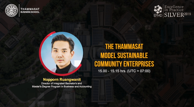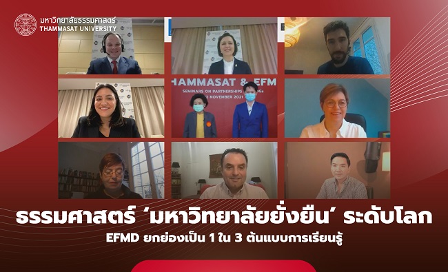 มหาวิทยาลัยธรรมศาสตร์ ร่วมกับ European Foundation for Management Development (EFMD) สถาบันประเมินคุณภาพการศึกษาจากสหภาพยุโรป จัดงานสัมมนาออนไลน์ หัวข้อ “Thammasat & EFMD Seminars on Partnerships for SDGs” เมื่อวันที่ 22 พ.ย. 2564 เพื่อแสดงถึงแนวทางการปฏิบัติที่เป็นแบบอย่างในการสร้างพันธมิตร จนเกิดการพัฒนาการเรียนรู้ร่วมกันระหว่างภาคการศึกษาและสังคม โดยมีต้นแบบ 3 โครงการด้านการพัฒนาที่ยั่งยืน (SDGs) ที่ได้รับรางวัล Excellence in Practice Award จาก EFMD