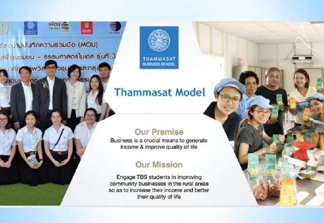 ผศ.ดร.นพพร เรืองวานิช ผู้อำนวยการหลักสูตรควบตรี-โท ทางการบัญชีและบริหารธุรกิจ (IBMP) คณะพาณิชยศาสตร์และการบัญชี มหาวิทยาลัยธรรมศาสตร์ นำเสนอโครงการว่า Thammasat Model เป็นโครงการที่นำนักศึกษาของคณะพาณิชยศาสตร์ฯ ลงไปทำงานใกล้ชิดกับชุมชนต่าง ๆ เพื่อนำองค์ความรู้ทางธุรกิจที่ได้จากห้องเรียนลงไปสนับสนุนชุมชนเพื่อยกระดับผลิตภัณฑ์ของชุมชน ซึ่งนอกจากจะเป็นการได้ช่วยเหลือชุมชนกว่า 160 แล้ว นักศึกษาก็จะได้สัมผัสกับการแก้ปัญหาจริง และได้ความรู้เกี่ยวกับภูมิปัญญาของท้องถิ่นต่าง ๆ อีกด้วย