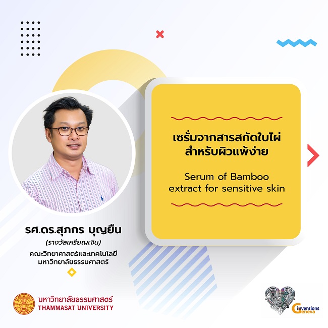 2. ผลิตภัณฑ์ เซรั่มและไมเซร่าชำระเครื่องสำอาง จากสารสกัดใบไผ่ซางหม่นนวลราชินี (Serum of bamboo extract for sensitive skin) โดย ผศ.ดร.สุภกร บุญยืน คณะวิทยาศาสตร์และเทคโนโลยี