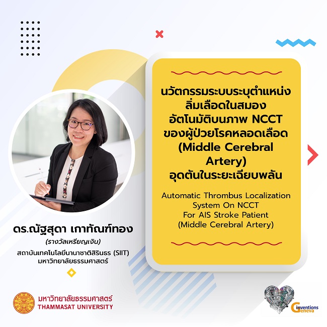 1. ระบบระบุตำแหน่งลิ่มเลือดในสมองโดยอัตโนมัติบนภาพ NCCT ของผู้ป่วยโรคหลอดเลือด (Middle Cerebral Artery) อุดตันในระยะเฉียบพลัน (Automatic thrombus localization system on NCCT for ais stroke patient (Middle cerebral artery)) โดย ดร.ณัฐสุดา เกาทัณฑ์ทอง สถาบันเทคโนโลยีนานาชาติสิรินธร (SIIT)