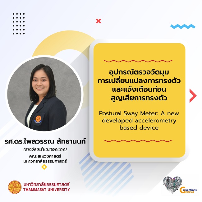 1. อุปกรณ์ตรวจวัดมุมการเปลี่ยนแปลงการทรงตัวและแจ้งเตือนก่อนสูญเสียการทรงตัว (Postural sway meter : a new developed accelerometry based device) โดย รศ.ดร.ไพลวรรณ สัทธานนท์ คณะสหเวชศาสตร์