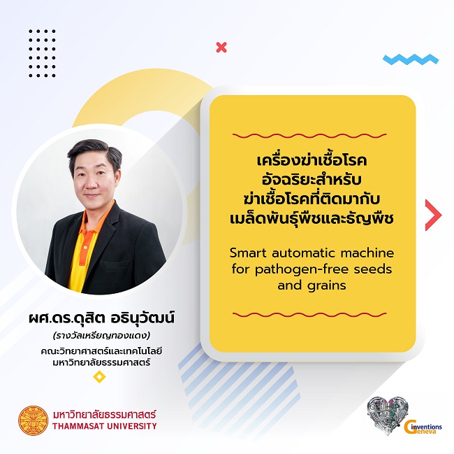 2. เครื่องฆ่าเชื้อโรคอัจฉริยะสำหรับฆ่าเชื้อโรคที่ติดมากับเมล็ดพันธุ์พืชและธัญพืช (Smart automatic machine for pathogen-free seeds and grains) โดย รศ.ดร.ดุสิต อธินุวัฒน์ คณะวิทยาศาสตร์และเทคโนโลยี