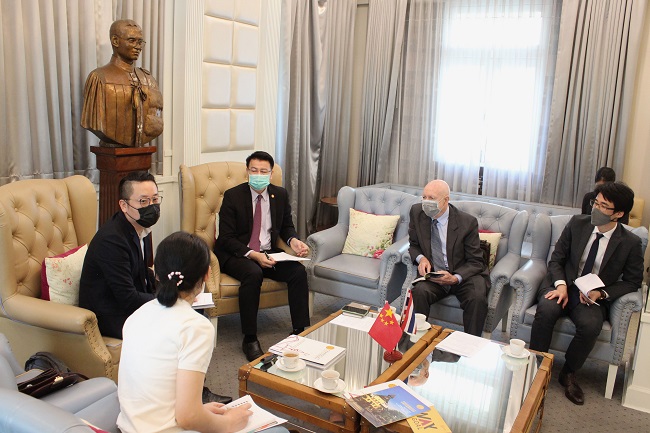 16 February 2021 - Vice Rector Kitti Prasirtsuk, along with Assoc. Prof. Dr. Fredric William Swierczek, Director of MBA in Global Business Management (GEMBA), Thammasat Business School and Dr. Amnart Tangkiriphimarn, Director of Master’s Program in Business Law, Faculty of Law, met with Mr. Guasiang Choa, Director of Asean Chinese Testing International Service Center and Ms. Hong Chou, coordinator of OPEN (Beijing National Center for Open & Distance Education) China. Both sides discussed a possibility of academic collaboration and sending Chinese students to enroll in GEMBA and LLM.