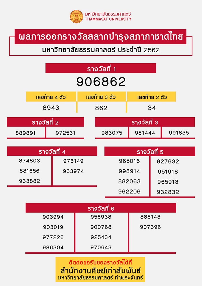ผู้ซื้อสลากบำรุงสภากาชาดไทย มหาวิทยาลัยธรรมศาสตร์ ประจำปี 2562 สามารถติดต่อขอรับรางวัลได้แล้วตั้งแต่วันนี้ ณ สำนักงานธรรมศาสตร์สัมพันธ์ มธ.ท่าพระจันทร์